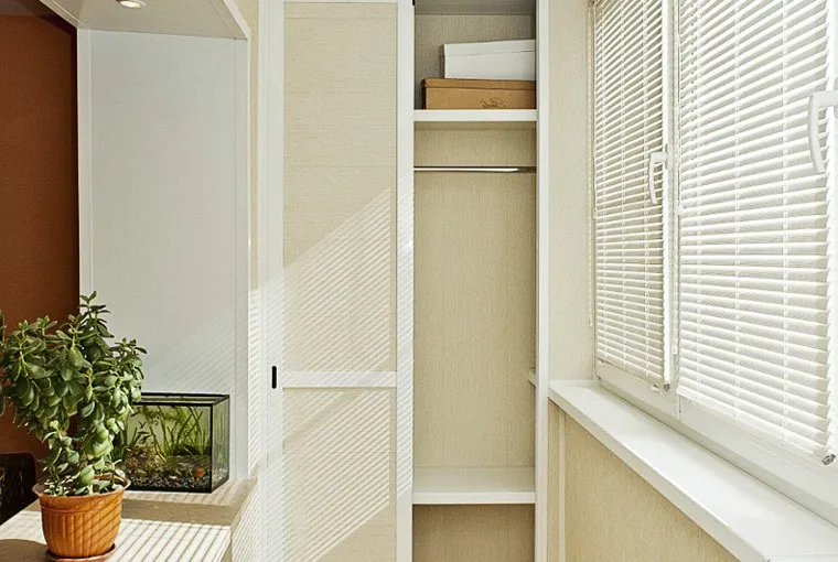 • Шкафы-купе. Установите на лоджии эргономичный шкаф с раздвижными дверями из ЛДСП, оформленными зеркалом, или без него. Он сэкономит полезное пространство и вместит в себя немало вещей. На ваш выбор количество секций, штанг, полочек, ящичков. Украсить фасад можно вставками из стекла или из основного материала с орнаментом. Вызывайте специалиста перед оформлением заказа, чтобы точно определить размеры будущего хранилища и встроить его максимально удобно в ваш интерьер.