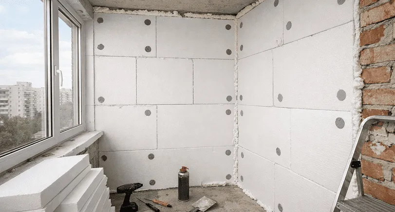 При утеплении балкона листы пенопласта монтируются на все поверхности с обязательной герметизацией швов, что исключает появление мостиков холода. Лёгкий вес материала не перегружает конструкцию, что особенно важно при утеплении балкона в новостройке или старом доме.