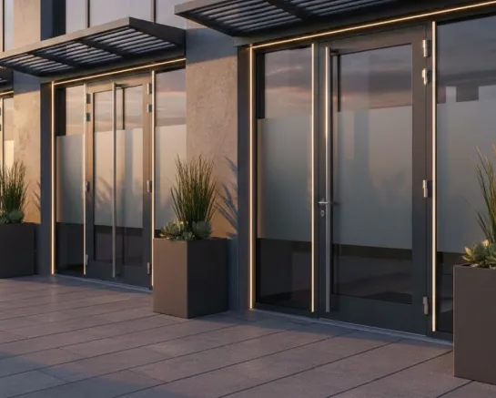 Входная группа — это комплексная конструкция, включающая двери, остекление, профиль, фурнитуру и элементы отделки, формирующие основной вход в здание.
