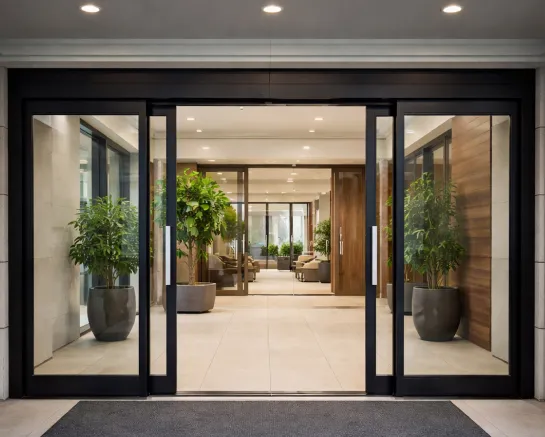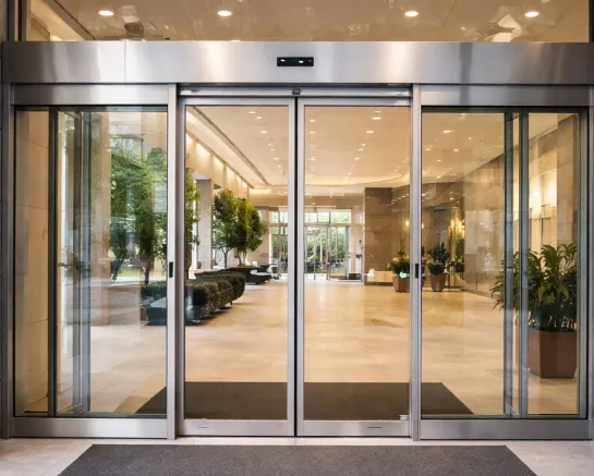 Распашные, раздвижные, автоматические, «гармошка», подъёмно-сдвижные — тип подбирается под размеры проёма и задачи объекта.