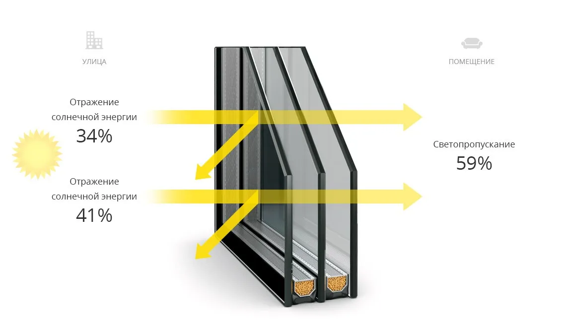 Стеклянные пакеты с защитой от солнца дороже стандартных, потому что изготавливаются по более сложной технологии. Они покрываются специальными пленками с тонирующим эффектом. Покрытия блокируют вредное для человека УФ-излучение и защищают шторы, обои, мебель от выгорания.