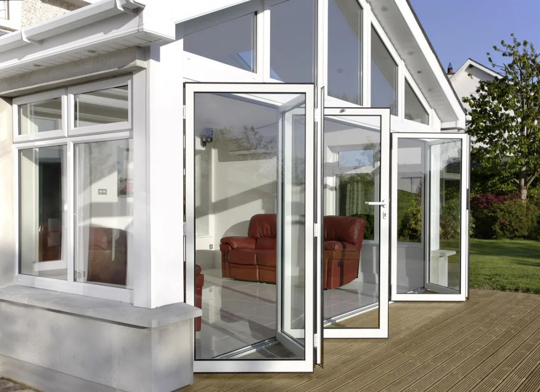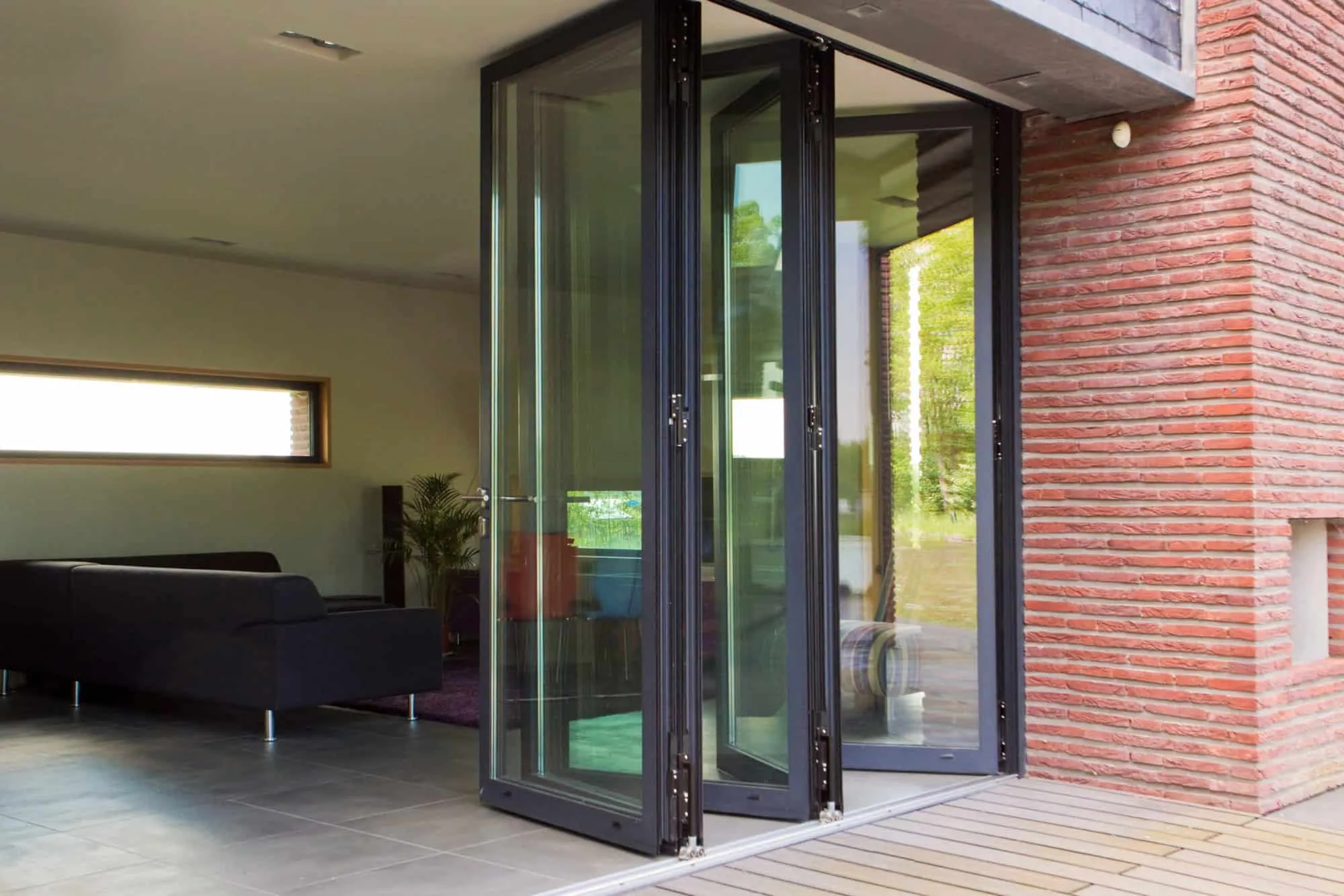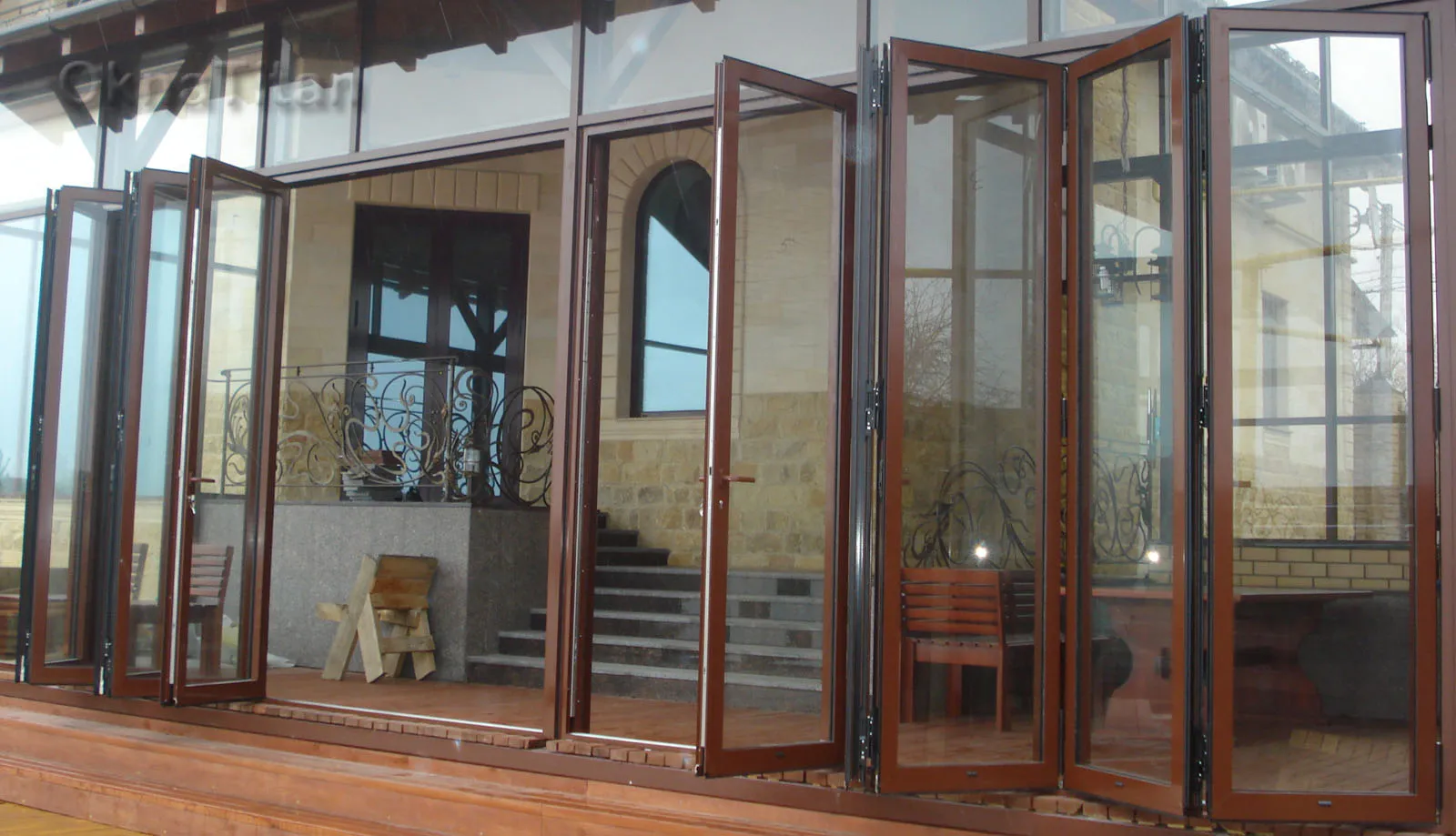 Складная «гармошка» полностью открывает проем, а одну из створок можно использовать как входную дверь.