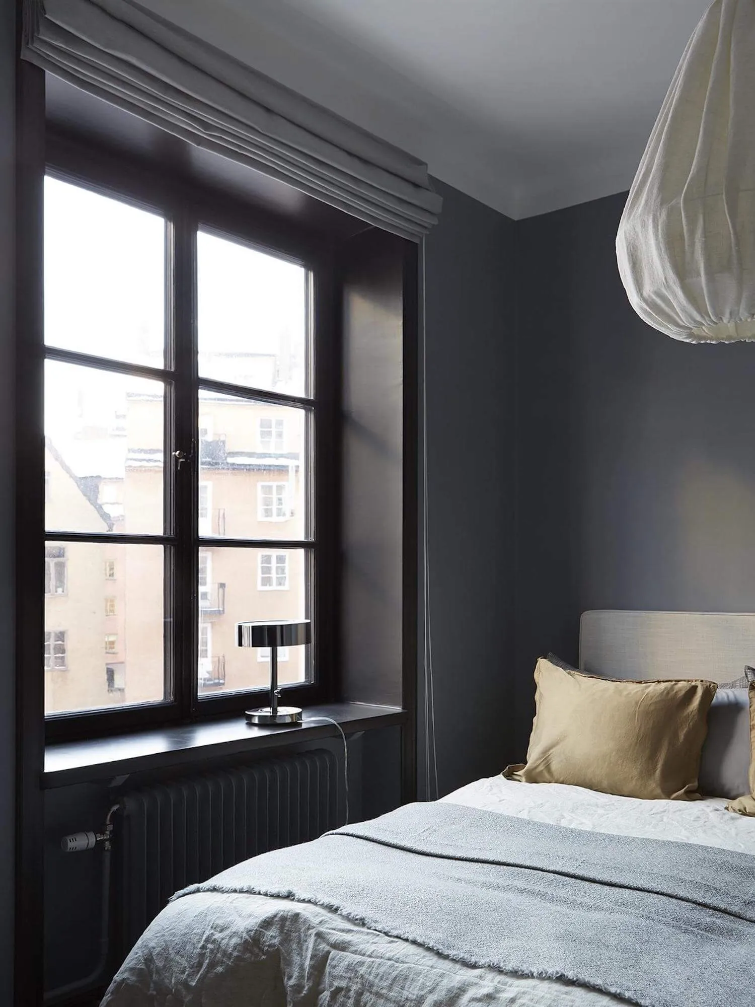 Черный цвет, кстати, намного более полезный, чем тот же белый. Не белые тона будут визуально расширять пространство (то есть, будут, но куда в меньшем объеме), а черные! Этот цвет как бы отодвигает стену или оконный пролет, делая комнату визуально больше. Черный цвет подчеркивает геометрию стены, например, оконные откосы под покраску можно окрасить черным, создав визуально подчеркнутую глубину для окна. Это особенно здорово смотрится, если у вас есть подоконники из натурального дерева. Причем, мы рекомендуем вообще окрашивать почти всю стену в черный вместе с рамами, как на фото ниже и выше. Это позволит скорректировать пространство и сделать его намного более интересным.